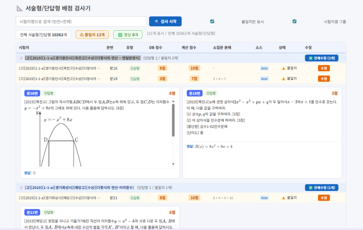 직접 사용하려고 만들고 보니 몇가지 문제 점이 보이면 수정에 많은 시간이 들어갑니다 이제 문제 없다 생각 했는데 채점확인 하다 보니 서술형 단답형 배점 처리가 이상한것 같고 그래서 전체를 다시 조사 해야 하지만 서술형만 1만개 넘어서 검사하기 위한 툴부터 만들고 확인 중인데 역시 쉬운 작업이 아니군요 한글 프로그램 문제 은행이 어려운건 hwp 다루는게 어려워서 인데 아무튼 다시 본업으로 돌아가면 지금은 가지고 있는데이터가 많아서 이걸 좀더 학원에 적극적으로 사용하면서 자료의 유출도 막고 선생님이 학생 관리 하기 편하도록 기능을 넣고 있는데 이런 채점 오류 가능성도 있네요~ 학생이 한문제도 지나치지 말고 틀린 문제....... <img src="https://blogthumb.pstatic.net/MjAyNjAyMjdfMjA2/MDAxNzcyMTU2MzgyMzIx.d1fEZihWqyyQrl2rdArwonfH_WQWg4nrdnnh0TeW8dIg.cVaDRq3PBhyQq0ng3dU_9ePwMf31i3_osPIEof-jz90g.PNG/image.png?type=s3" />