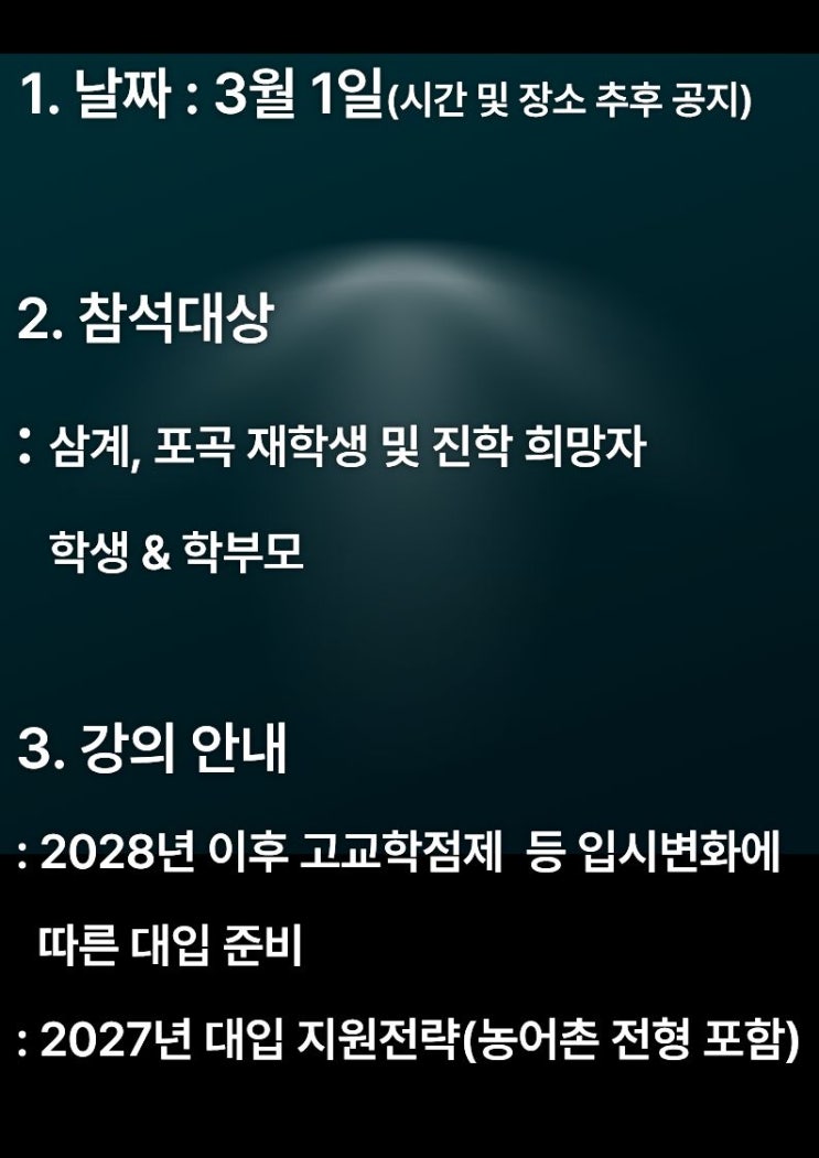 안녕하세요, 따뜻한 봄바람과 함께 3월 개학이 곧 시작됩니다. 겨우내 바쁘게 보낸 우리 아이들과의 소중한 시간도 어느새 추억이 되어 가네요. 서림 더 프라임은 삼계고 1·2학년 학생들을 위해 3월 개학과 동시에 내신 집중 수업을 바로 시작합니다. 저희 학원 자체 제작한 100% 맞춤 내신 교재는 모든 문제와 변형 문제, 핵심 설명까지 꼼꼼하게 준비하여, 높은 내신 등급 달성에 최적화되어 있습니다. 중간고사 후 결과와 적중률에서 차이를 느끼실 수 있을 것입니다. 또한 3월 1일 오후 3시, 용인 자연휴양림 내 산림교육센터에서 삼계고·포곡고 학생과 학부모님을 위한 진학 설명회를 개최하오니, 관심 있는 분들의 많은 참여 부탁드립니다....... <img src="https://blogthumb.pstatic.net/MjAyNjAyMjdfMzgg/MDAxNzcyMTcxMjAzMzcw.STWJurChSmMo_-voHXLyVRIM9hXPNfS6WGLiYz5B7gcg.hTLIiDvOk9kU2Ay5OnvxlkQBLM6LyfoHGG0T66rBAhEg.JPEG/3.jpg?type=s3" />