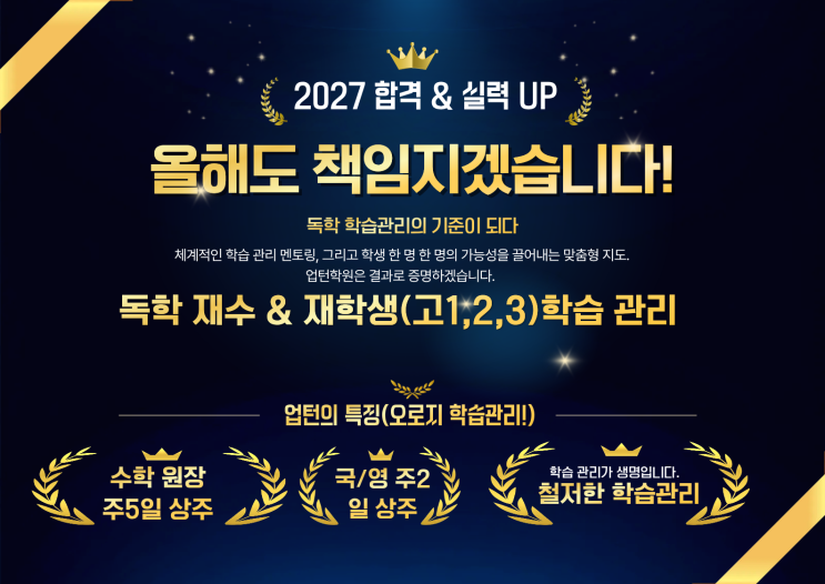 업턴 관리형 독서실 & 독학재수학원입니다. 입시의 성공여부는 "철저한 학습 관리"에 달려있습니다. 속이 꽉찬 내실있고 철저한 학습관리가 생명입니다. 업턴은 "오로지 학습관리! 학습관리! 학습관리!"를 모토로 합니다. 수학원장님이 주5일 상주합니다. 김석호 원장이 직접 "수학 집중케어" 합니다. 수학 학습 관리 및 "1:1 클리닉"을 안내합니다. 학원시설은 최상입니다. 특히 책상은 학생들이 자습하기에 크기가 넉넉하여 최상입니다. 언제든지 문의해 주세요. 자세한 상담 및 방문으로 미리 "2027학년 무조건 합격"을 예약하세요. 학원 대표전화 : 031-8077-2225 수학 원장 휴대폰 :....... <img src="https://blogthumb.pstatic.net/MjAyNjAzMDNfMjQ2/MDAxNzcyNTE3MzIyNjE3.byVEY4-iovjbDLGHPj4YNtkv1mYbQOY-58PScZY-yYEg.Z4s35IhSMOhz5U7o25_tjuUZgWW0m5k1R42pVfvx4wog.PNG/%BE%F7%C5%CF%28%C0%FC%C3%BC%BC%D2%B0%B3%29.png?type=s3" />