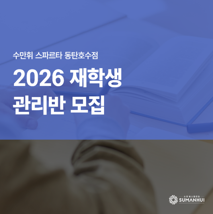안녕하십니까! 수만휘 스파르타 동탄호수점입니다:) 곧 새학기가 시작되는 3월이 다가옵니다! 수만휘 스파르타 동탄호수점에서는 2026 3월 재학생 관리반 모집중입니다! ★수만휘 스파르타 동탄 호수점 위치★ ★수만휘 공식 홈페이지★ <img src="https://blogthumb.pstatic.net/MjAyNjAyMjBfMjAz/MDAxNzcxNTU4ODI0OTY3.nnOy5JJuszJ7XHm-Cfr-F3qJf5FS3ZLv0Z_jUi05maog.q_6llr870gr7f8u_lhr2m1nIF0Q23VB0cBcJ1ebuc7wg.PNG/image.png?type=s3" />