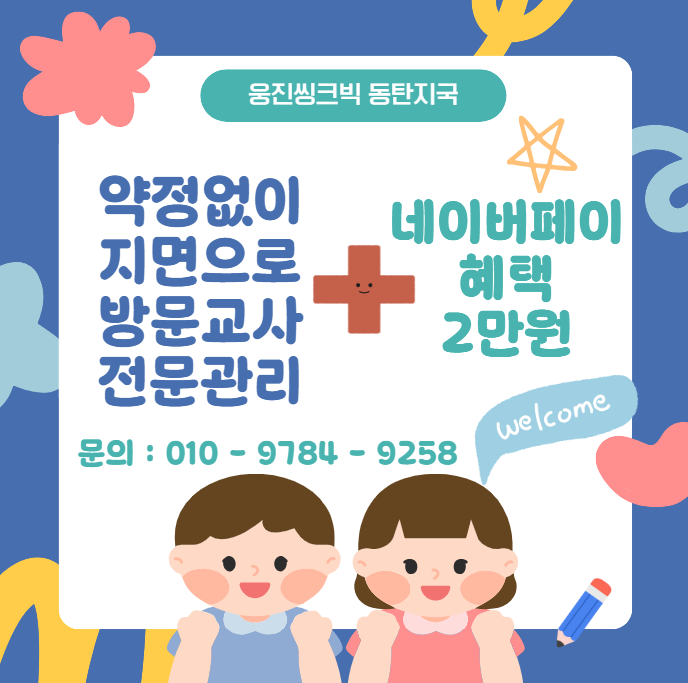 웅진씽크빅 동탄지국 약정 없이, 지면으로, 방문교사 전문관리 “좋은 학습은 하고 싶은데… 약정 때문에 망설여지셨나요?” 이제 부담 없이 시작하세요. ✔ 약정 없이 시작합니다 장기 계약 없이 아이에게 맞는지 직접 경험 후 결정하세요. 학습은 신중해야 합니다. 그래서 웅진씽크빅은 선택의 부담을 줄였습니다. ✔ 지면 학습 + 방문교사 전문관리 요즘 스마트학습만으로는 ✔ 집중력 관리 ✔ 오답 점검 ✔ 학습 습관 형성 이 쉽지 않습니다. 웅진씽크빅은 다릅니다. 지면 중심 학습으로 기초 탄탄 방문교사 1:1 맞춤 관리 진도·오답·습관까지 전문 케어 “공부는 콘텐츠보다 관리가 더 중요합니다.” 지금 시작하면 특....... <img src="https://blogthumb.pstatic.net/MjAyNjAyMjBfNDUg/MDAxNzcxNTk3MDQxMDA5.1PsjZVNSiPgy_lHxBD7b_G56dJqrJ5JgXGArvrVNq8wg.lQmstiI8uSa93-b3LALSczEQskKdIiZ98665GKwKu0wg.PNG/image.png?type=s3" />