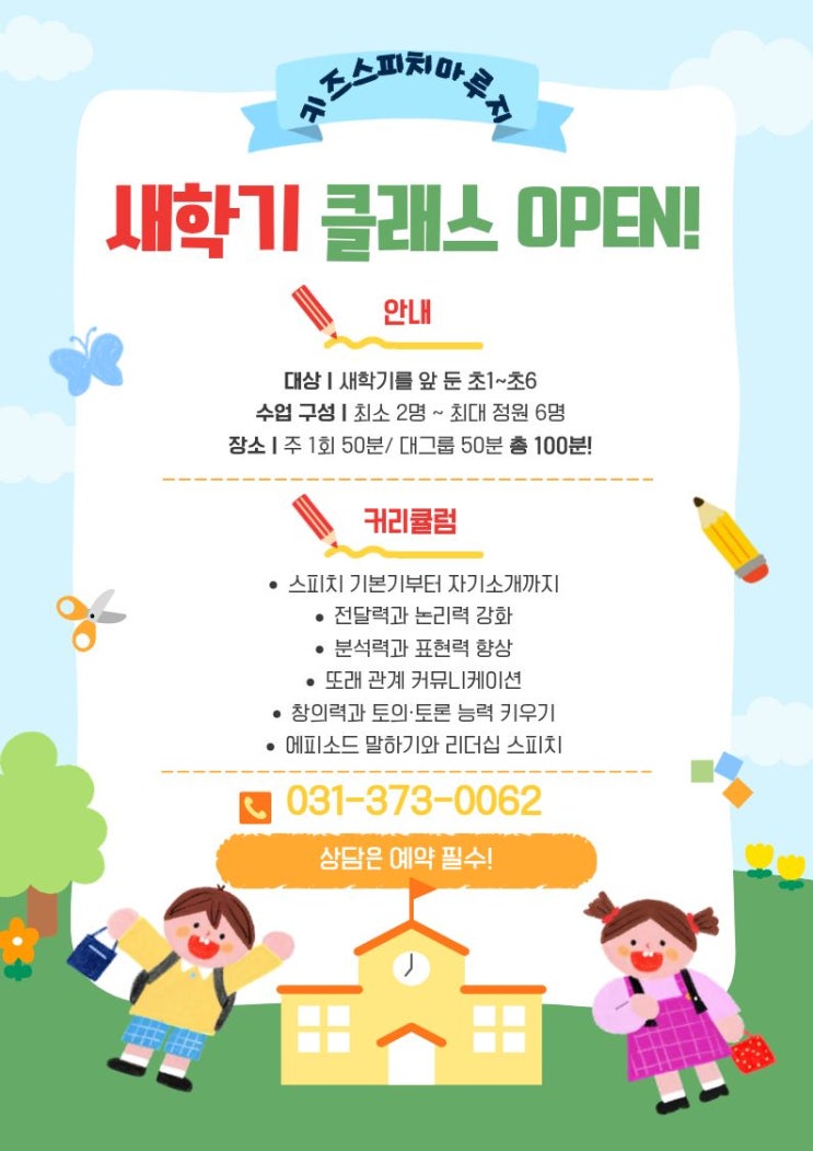 2월도 훌쩍 흘러 곧 3월입니다. 우리 아이 새 학기 대비 잘 하고 있나요? 새 학기가 되면 새로운 환경에 새로운 친구들과 적응하는 시간이 필요하죠~! 친구들에게 아이의 첫인상이 결정되는 중요한 시기인데요. 쭈뼛쭈뼛 움직이고, 웅얼웅얼 말한다면 어떨까요? 친해지고 싶은 친구가 있어도 선생님께 할 말이 있어도 표현하지 못해 답답해할 거예요. 새 학기에 자신감 있게 친구 사귀고 발표도 자신 있게 하는 아이 만들기 프로젝트! 스피치 기본기부터 자기소개까지 말하기의 기초를 탄탄히 다져 자신감 UP! 전달력과 논리력 강화 정확하고 설득력 있는 표현법 교육 분석력과 표현력 향상 글과 감정을 생생하게 표현하는 법 익히기 창의력과 토....... <img src="https://blogthumb.pstatic.net/MjAyNjAyMjVfMTM0/MDAxNzcxOTk2ODEyMzgx.owxWBAauuw9QjX0IXgULMNV_Ug32JK9YJ6DbbT4Xm3cg.a3uJDaZuUqKxCCCkAHuXP9MQx2oHuk7t8QraiXtwewMg.JPEG/%BB%F5%C7%D0%B1%E2_%C5%AC%B7%A1%BD%BA.jpg?type=s3" />