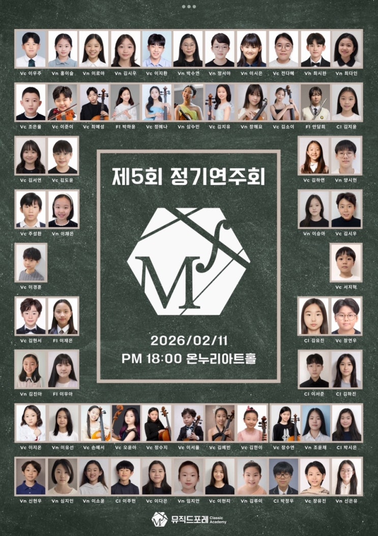 ✨지난주 수요일, 뮤직드포레 음악학원 제5회 정기연주회가 열렸습니다 ✨ 몇 달간 차곡차곡 준비해 온 아이들이 무대 위에서 가장 빛났던 하루였어요. 오늘은 그 반짝이던 하루의 ‘무대 뒤 이야기’를 기록해보려 합니다.☺️ 이번 제5회 정기연주회 포스터는 조금 더 특별한 의미를 담아 준비했습니다. 참여한 아이들 한 명 한 명의 얼굴을 모두 포스터에 담았습니다. 누구 하나 빠짐없이, 각자의 자리에서 노력해온 시간들이 모여 하나의 무대를 완성했기 때문입니다. 아이들에게도 “나도 이 무대의 주인공이구나”라는 작은 자부심이 되었기를 바랍니다. 몇 번 무대를 경험해본 친구들이 많아서인지 리허설부터 본 연주까지 꽤 긴 시간....... <img src="https://blogthumb.pstatic.net/MjAyNjAyMjBfMjQx/MDAxNzcxNTczNzQ4ODI3.l_-uwvOWw4Kwg3REas0Rqo4cX8qu1lfB7ec8toW8bR8g.4athviQCTfSOv9THRm_w08KBuMprNPSzPvayQZ52jlog.JPEG/IMG%A3%DF0448.jpg?type=s3" />