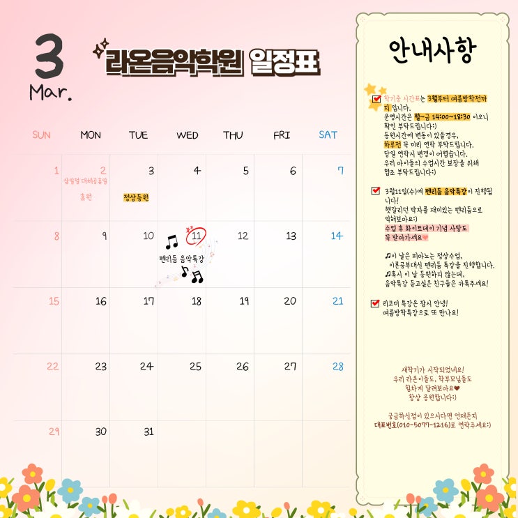 새솔라온음악학원 3월 일정표♥