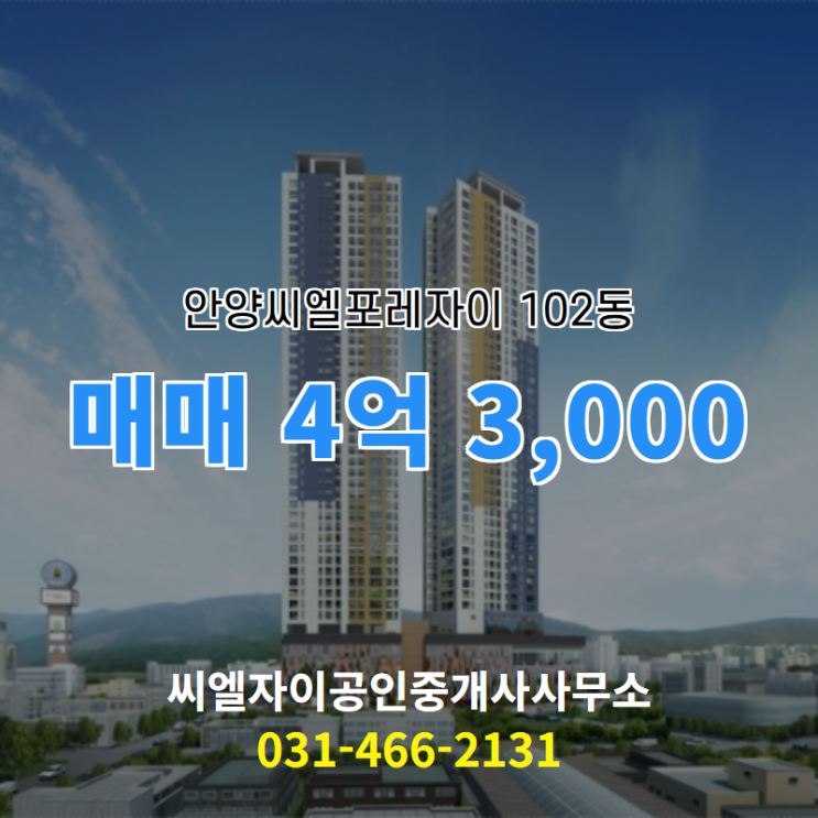 고객님! 안양동 아파트 매물 찾고 계세요? 현재 확인 가능한 아파트 매물 리스트를 안내해 드립니다 :D 평면도 기본형 확장형 씨엘자이공인중개사사무소는 네이버 확인매물만을 소개합니다! 안양씨엘포레자이의 배정학교는 안양초등학교 입니다. 씨엘자이공인중개사사무소 오시는 길 위치 : 경기도 안양시 만안구 안양6동 1416 근린생활시설2동 103호(안양동,안양씨엘포레자이) 공인중개사법 개정에 대한 표시의무 사항 명시 공인중개사법 18조2,4항에 의거하여 해당 매물은 포스팅 당시 진성매물임을 확인 하였으나 포스팅 내용을 보는 시점에 거래가 완료되었을 수 있으니 유선상 해당 매물이 아직 있는지 여부를 확인해 주세요 포스팅 일시 : ....... <img src="https://blogthumb.pstatic.net/MjAyNjAzMjlfODMg/MDAxNzc0NzQwODY0MjQy.UGu7bp8NjUtX4UvoQ_xJYKi7VLITF9u5YzY17pbGYCAg.ea0I7ULf-hAWflv4-sxzgmd9hVUnYpsZCfxvmdilJUEg.PNG/0408b6d5-10f7-4547-be16-4ad804376515.png?type=s3" />