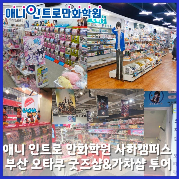 애니인트로만화학원 사하캠퍼스 가차샵&굿즈샵 오타쿠 순례 루트(부산 ver)/하단 애니학원/사하 만화학원 안녕하세요! 부산 사하 인트로만화학원 입니다 오늘은 오랜 기간 오타쿠 수련(?)을 거쳐, 드디어 ✨저만의 오타쿠 순례 루트(부산ver)를 몇몇 공개하려고 합니다! 애니메이션을 좋아하는 분들이라면 한 번쯤은 “부산에도 이런 곳이 있었어?” 하고 놀랄 만한 장소들이 은근히 많은데요! 굿즈를 구경할 수 있는 곳부터 애니메이션 분위기를 느낄 수 있는 공간들까지, 직접 다니며 발견한 곳들을 정리해 보았습니다! 1. 브라더 굿즈 2. 애니메클럽 3. 가챠샵 4. 에스엠지굿즈스토어 5. 오지는 오타쿠 요즘은 애니메이션이 더 이상....... <img src="https://blogthumb.pstatic.net/MjAyNjAzMTZfMjU5/MDAxNzczNjM4OTI1NDgz.oQJhRvEqy4ZEVO3BGRPA8bSqvZOzNL50dosAV_bNQr8g.Ez2tAUMVM64vxP1mMsQES-XEjYg0GnEn3NBF9JuzoOYg.JPEG/KakaoTalk_20260303_172105962_03%A4%A7%A4%A9%A4%A7%A4%A9%A4%A7%A4%A9%A4%A7%A4%A9.jpg?type=s3" />