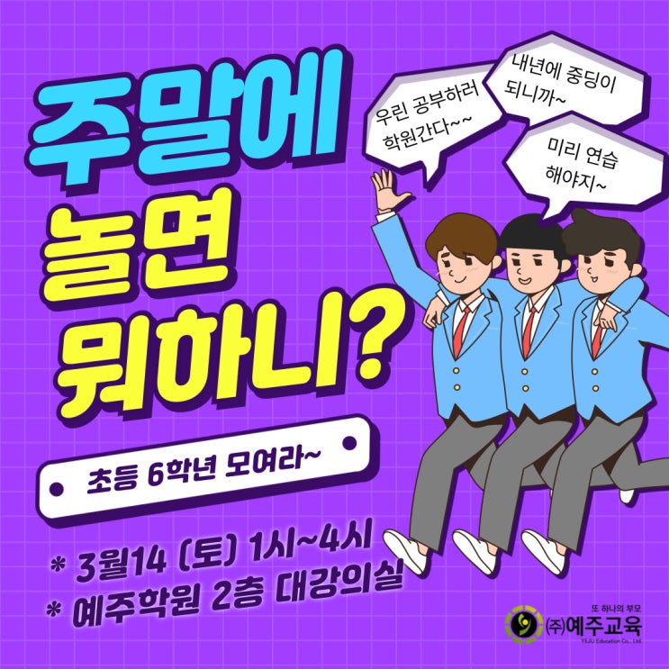 얘들아 주말에 뭐해? 놀러 가? 게임해? 늦잠 자? 예주학원 초6 아이들은 주말에 학원에서 공부합니다. 왜냐고요? 내년에 중학생이니까 미리 연습해야 하거든요. 중학교에 올라가면 상황이 달라집니다. 수학 난이도는 갑자기 올라가고 영어는 내신 시험 중심으로 바뀝니다. 그리고 시험대비라는 기간이 있습니다. 준비 없이 올라가면 첫 시험에서 많은 아이들이 “중학교 공부 어렵다… 시험기간 힘들다...” 라는 말을 하게 됩니다. 그래서 예주학원에서는 초6 학생들을 위해 주말 공부 근력키우기 수업을 진행합니다. 수학, 영어 공부 근력 키우는 시간 3/21 토요일 1:00~4:00 이러한 훈련을 통해 아이들이 중학교 공부와 내신 대비 기간에....... <img src="https://blogthumb.pstatic.net/MjAyNjAzMTZfMjkw/MDAxNzczNjU4OTc0Nzcw.BK1jpJjPHy8wBEXMF8XwaHMKOAIoZQjrzF8FcW80lVcg.X5ET9Cr8POjw7TLakRyVNl1lWIKw8mRBW2DPTmSxp4Mg.JPEG/004.jpg?type=s3" />