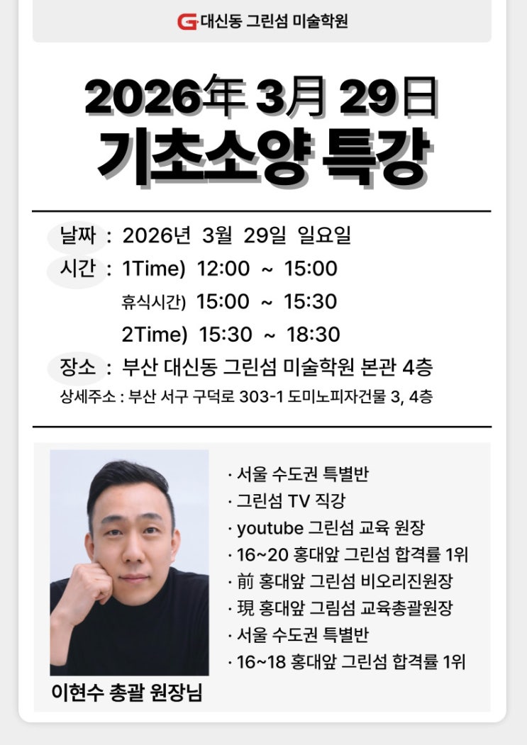 안녕하세요~ 대신동 그린섬 미술 학원입니다! 미대 입시를 준비하는 학생들에게 꼭 필요한 기초소양 수업 특강이 매달 대신동 그린섬에서 열리고 있는 것을 아시나요? 학생들의 사고력과 문제해결 능력을 키워주기 위해 꼭 필요한 수업입니다. 이번 3월 29일 특강 역시 수도권 미대 입시를 준비하는 학생들에게 도움이 되는 내용으로 준비되었습니다. 기초소양 특강은 이현수 총괄 원장님께서 직접 강의합니다. 오랜 입시 경험을 바탕으로 수도권 미대 입시 전략을 지도해오신 분입니다. 최근 서울 수도권 미대에서는 단순 실기 능력뿐만 아닌 ○ 사고력 ○ 문제 분석 능력 ○ 아이디어 전개 능력 등을 함께 평가하는 경우가 많습니다. 그래서 기....... <img src="https://blogthumb.pstatic.net/MjAyNjAzMTZfODUg/MDAxNzczNjU2NzQxODkz.oht2bBZGYO6Yys0wNhdTPKcuzyWmkevhGRbhkfmFhu8g.hnwL6JEdG2UDwVyUxAY0OQEvxa6PeFEYMHJFPTCeuQ4g.JPEG/3%BF%F9-%B1%E2%BC%D2-001.jpg?type=s3" />