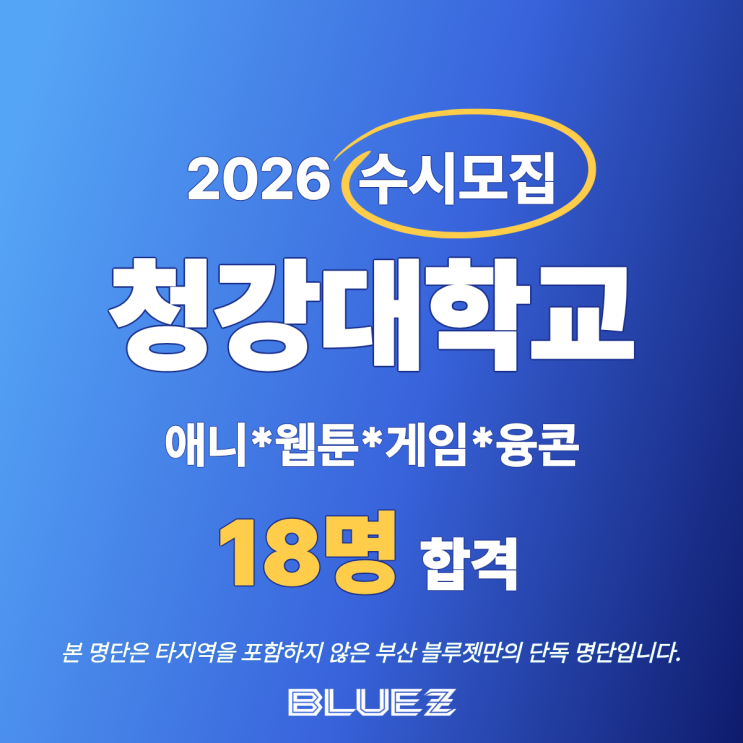 안녕하세요. 부산 대신동 입시 만화학원 블루젯미술학원입니다. 오늘은 2026학년도 수시모집 청강대학교 애니 웹툰만화 게임 융합콘텐츠 합격 소식을 기쁜 마음으로 전해드립니다. 2026학년도 수시모집 청강대학교 애니 웹툰만화 게임 융콘 ✨️18명 합격✨️ 2026학년도 수시모집 청강대학교 합격을 축하합니다. 노력한 만큼의 결실을 맺은 블루젯미술학원 수강생 여러분께 진심으로 합격을 축하드립니다. 이번 2026학년도 수시모집에서도 학생 한 명, 한 명의 목표와 개성에 맞춘 수업을 통해 소중한 합격 결과를 만들어낼 수 있었습니다. 결과보다 더 값진 과정이 있었기에 이번 합격이 더욱 의미 있다고 생각합니다. 남은 여정도 블루젯이 끝....... <img src="https://blogthumb.pstatic.net/MjAyNjAxMDJfMjIw/MDAxNzY3MzQ0MDMxNTIz.IVvX97yGEE48-G9rEERtKyfPUkZj5NFkBn7DBPBWWHEg.IRxVuVplhwJ2BTmQ7YMqhaN054tpNWlO2QKj3DjgC7Qg.PNG/%C3%BB%B0%AD%B4%EB.png?type=s3" />
