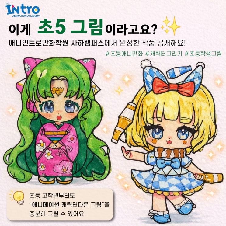 "이게 초5 그림이라고요?" 부산 애니인트로만화학원에서 완성한 캐릭터 일러스트 [사하 만화학원] *초등 애니만화 카피 수업 결과물 공개* 안녕하세요 부산 애니인트로 만화학원 사하캠퍼스입니다! 오늘은 지난 12월 무렵부터 등원을 시작한, 이제 초등학교 5학년이 되는 서○주 학생의 캐릭터 일러스트 카피 작품을 소개해드리려고 합니다. 서○주 학생은 이전에 다니던 학원을 중단한 후 새롭게 애니인트로를 선택해 등원을 시작했는데요, 아직 한 달 남짓한 시간이 지났지만 벌써 선생님들과 자연스럽게 어울리며 도란도란 이야기를 나누는, 밝고 즐거운 분위기 속에서 수업에 참여하고 있습니다. 짧은 기간임에도 수업에 대한 집중....... <img src="https://blogthumb.pstatic.net/MjAyNjAxMDNfNzAg/MDAxNzY3NDIyMjE4NjA1.GdP9Gp2JMcbPBdQsWsDHhb4wgE8GodevpWNvKJxG_Zsg.7KuPtnw_pwSBizIyaXpKCAhmZ3FI9VHarHAvCqMu3Ngg.JPEG/1.jpg?type=s3" />