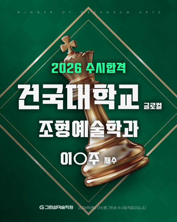 2026학년도 건국대 조형예술학과 수시 합격 " 작년과 같은 재수라면 의미 없습니다 " 2025학년도, 실기 성적이 좋지 않았던 상태에서 재수를 선택했습니다. 하지만 1년 뒤의 결과는 완전히 달라졌죠! 건국대 포함 수시 5개 대학 합격 그 차이는 단순 '연습량'이 아닌, 재수를 대하는 방식 자체였습니다. 작년 재수 실패의 원인은 ▶ 열심히 그렸지만 방향성이 없던 연습 ▶ 시험장에서 점수로 연결되지 않는 그림 ▶ 조형 감각보다 손에 익은 표현 반복 많은 재수생들이 겪는 상황과 크게 다르지 않았습니다. 그래서 재수 가장 초반에 한 건 더 잘 그리기가 아니라 왜 떨어졌는지 정확히 아는 것이었습니다. 잘 그린 그....... <img src="https://blogthumb.pstatic.net/MjAyNjAxMDVfOTUg/MDAxNzY3NjA2NzYxNTIz.RvpE98rIf0oVpotYMkkclxKE7ATWQ0oLYhKpiA0Pg4kg.GpmyzZCMq2woRKn49uYzcY_albb4Id80fk3rGtIwn7og.JPEG/%B0%C7%B1%B9%B4%EB_%C0%CC%C1%F8%C1%D6.jpg?type=s3" />