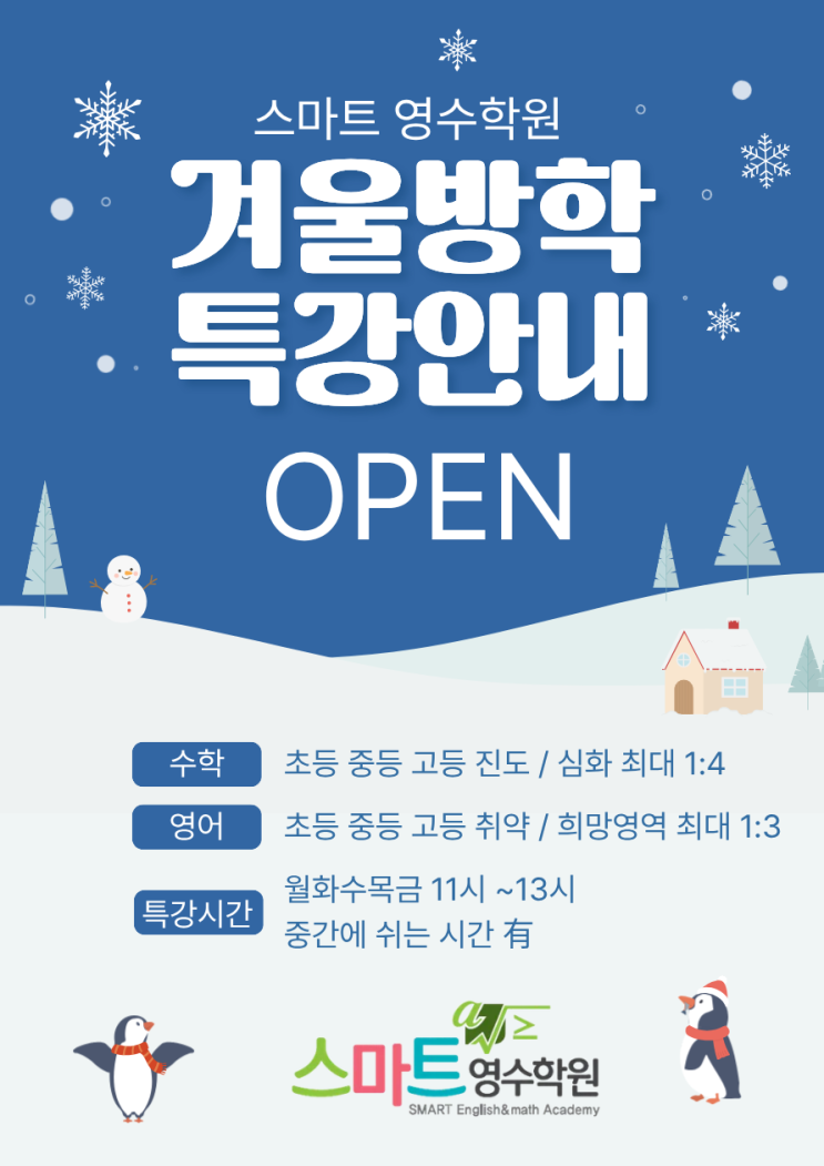 안녕하세요 학부모님 스마트 학원 재원생대상 2025년 겨울방학 수학특강/영어특강 안내드립니다! ♥특강도 개별 수업이기 때문에 시작일자와 종료일자 제한 없이 신청 원하시는 날짜로 하루씩 집어 신청 주시면 됩니다. 최대한 개설되도록 노력해보겠습니다! (단, 신청자가 너무 저조하거나, 강의실 만석이라 수업 불가한 경우 따로 연락드리겠습니다.) ♥ 특강 신청은 최대한 빨리 부탁드리며 늦게 신청할 시 혹은 모든 날짜에 선생님 배치가 안 될 수 있는 점 양해 부탁드립니다! ⭐ 2025 겨울방학 수학/영어특강 강좌안내⭐ ⭐ 영어특강반이 신설되었으니 많은 참여 바랍니다. ⭐ 이번 겨울방학에 영어 특강이 신설되었습니다. 교사....... <img src="https://blogthumb.pstatic.net/MjAyNTExMjVfMjEx/MDAxNzY0MDUzNjU3NzA4.Z5Ri_sYN9m57KoEArwqShgLAULqD2Jk-K1eLkGYFL98g.WM4lKVVBDEDfTNcoxdyGg7tc2lZdvlIqBWNLUoUjkyog.PNG/%C1%A6%B8%F1%C0%BB_%C0%D4%B7%C2%C7%D8%C1%D6%BC%BC%BF%E4_%284%29.png?type=s3" />