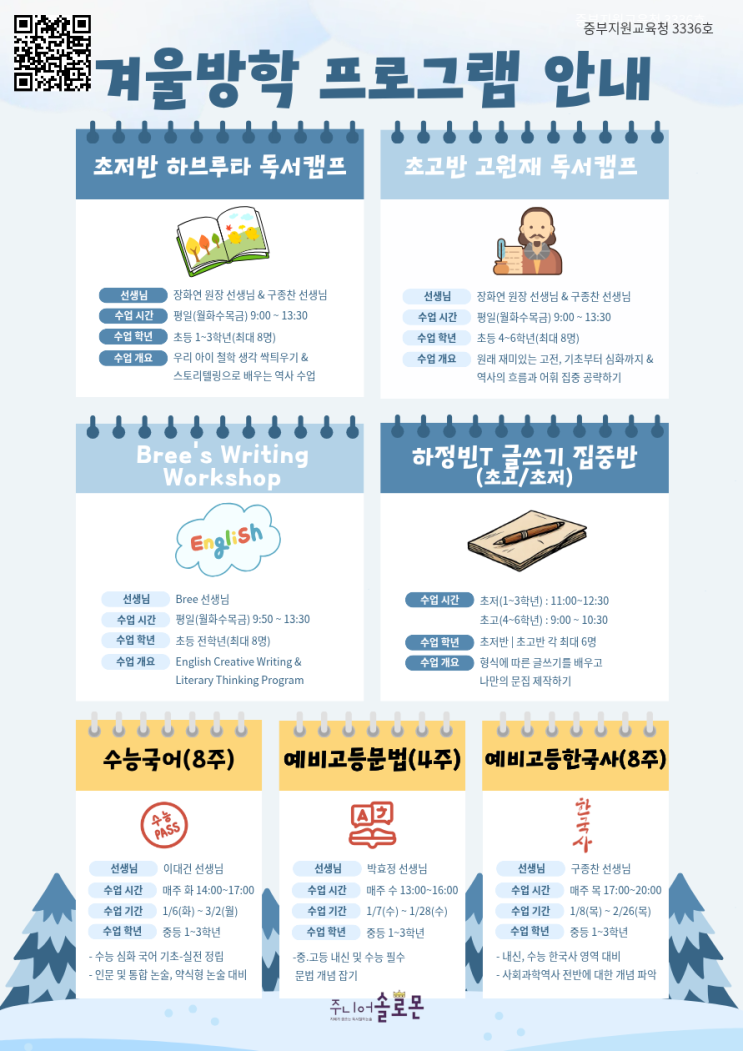 2026년 1월, 아이들과 함께할 성심솔뫼학원의 겨울방학 프로그램 안내드립니다! ** 해당 수업은 정규수업을 제외한 특강 수업입니다. ** 학교 / 학년 / Level 별로 진행되는 정규수업 문의: 02-703-8400 ** 정규수업 과목: 국어 / 영어 / 수학 / 과학 수업 문의 및 신청: 2025년 12월 8일 부터 선착순 신청 "OOO 학생 OO특강 문의합니다" 또는 "OOO 학생 OO특강 신청합니다" * 상담 전화가 몰릴 경우 원활한 상담이 어려워 되도록 문자 메시지 부탁드립니다.^^ 010-9284-3505 02-703-8400 "입시를 설계하다" 성심솔뫼학원.