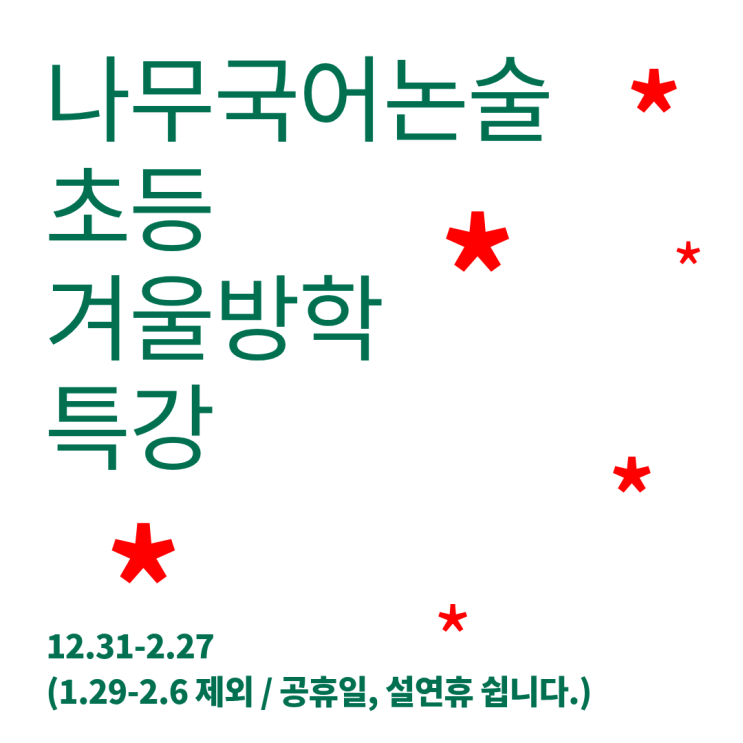 안녕하세요? 나무국어논술입니다. 올해도 우리 친구들이 즐거운 추억 가득한 방학 만들어나갔으면 합니다. 1. 방학 오전 시간을 다양한 수업을 조합할 수 있게 만들었습니다. 2. 재원생들만의 특강이 있습니다. (한자, 글쓰기 부스터는 재원생만 신청 가능) 3. 채널을 통해 1차 공개하고 -> 지역 카페에 2차 공개할 예정입니다. 4. 마감된 수업의 경우 가능하면 추가 반을 만들려 하고 있습니다. 5. 집중독서 월수반? ,NIE , IB주제탐구수업등 추가 과목 개설을 고려하고 있습니다. ** 프로그램의 한 줄 요약 포인트입니다.** 1. 집중독서: 정독 훈련의 완성, 어휘와 글쓰기까지 통합하는 몰입 독서 프로그램 2. 어린이 작가: 나만의 책 출간....... <img src="https://blogthumb.pstatic.net/MjAyNTEyMDZfMzAg/MDAxNzY0OTk0NTcyMTQ3.gnbMFgPlPO-GdlclTeKGBeZ0bsblldhLwGsJpnEFNygg.YLvzxtSTs2TlYZZpSHBLXPZ3ItbCK8itPEEb01wv1Uog.PNG/1.png?type=s3" />