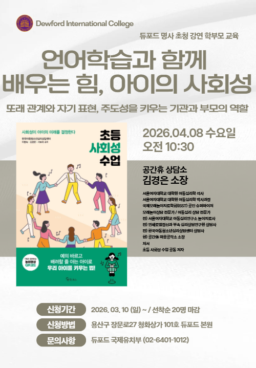 안녕하세요, Dewford(듀포드)입니다. 빠르게 변화하는 AI 시대, 우리 부모님들의 고민은 깊어만 갑니다. "지식은 AI가 더 많이 아는 세상인데, 우리 아이는 무엇을 배워야 할까?" 그 답은 역설적이게도 AI가 흉내 낼 수 없는 '가장 인간적인 능력'인 사회·정서 발달(Social Emotional Development) 이번 Dewford 학부모 강연은 급변하는 교육 패러다임 속에서 우리 아이들이 갖춰야 할 핵심 역량이 무엇인지 함께 고민해 보는 소중한 시간이 될 것입니다. 듀포드 학부모 강연이 특별한 세가지 이유! 1. 전문가와 함께하는 밀착 Q&A 강연 후 30분간의 질의응답 시간이 마련되어 있습니다. 평소 아이를 키우며 막막했....... <img src="https://blogthumb.pstatic.net/MjAyNjAzMTJfMTY1/MDAxNzczMjg1MDk5NDk2.WFKRhtz7ystg2ak1LPlxHJskNeSZvd_0UDYYRkgXAQ4g.ZiCOkPCXNrrSFT5jeLzYH7Y_55OWxH8-Ne_ttGIL1awg.PNG/KakaoTalk_20260311_134736234.png?type=s3" />