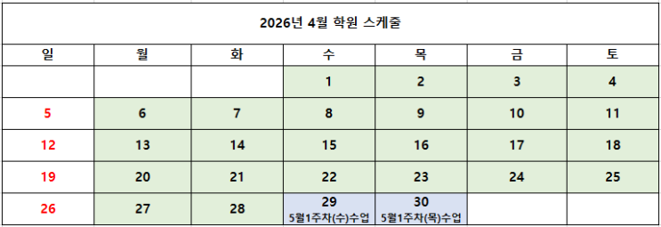 안녕하세요, 학부모님. 따뜻한 봄과 함께 새학기가 시작되었습니다. 아이들도 학부모님들께서도 새로운 학기에 적응하시느라 바쁘실 텐데, 그 과정 속에서 열심히 적응해 나가는 우리 아이들의 모습이 참 기특하게 느껴지는 시기입니다. 올해부터는 학원 휴무일 및 정상 수업 일정을 미리 안내해 드려 가정에서도 미리 일정을 계획하실 수 있도록 하고자 합니다. 이와 같이 운영하는 이유는 특정 요일에 연휴가 집중되는 경우가 있고, 이에 따라 수업 시수가 줄어드는 것을 방지하여 매달 4주 수업 시수를 안정적으로 보장해 드리기 위함입니다. 연간 캘린더는 이코딩 앱 내 게시판에 미리 업로드 해 두었으니 확인 부탁드립니다. 확인하시다가 궁....... <img src="https://blogthumb.pstatic.net/MjAyNjAzMDlfMTgx/MDAxNzczMDQ3NDY2MDU4.YnC0hg_D5pSk2qKyVAN4TT80ZM447u45F8PC3Bp6T6Ug.1wo4At9fG8r8o-ztj70IHrR9EOQNKYPDmBLl2X3fNm4g.PNG/4%BF%F9.png?type=s3" />