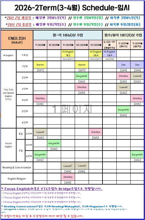 [성인] 26년2학기(3월~4월) 영어회화 임시시간표|