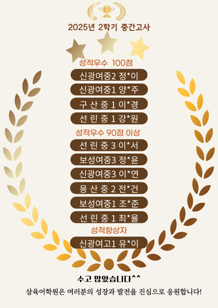 "성적우수자 여러분, 진심으로 축하합니다!“ 시험 기간 동안 선생님과 함께 열심히 노력하더니 멋진 결실을 맺었네요. 노력은 결코 배신하지 않는다!!! 삼육어학원 남영점은 항상 여러분들의 노력과 빛나는 결실 순간을 응원합니다. 다음 시험에서도 오늘의 주인공과 또 다른 이름들을 기대하며. <img src="https://blogthumb.pstatic.net/MjAyNTEyMDhfMTAw/MDAxNzY1MTgzMDgwMjQ3.kyjg2XaToClecqcjMePEUAXpuQZ8iW030LzNm82l7Tsg.k0WJuYcOgYz4kRJrlAS6yXdmoCUm_FLEk5zehSxX0AEg.JPEG/%BC%BA%C0%FB%BF%EC%BC%F6%C0%DA-25-2%C7%D0%B1%E2%C1%DF%B0%A3.jpg?type=s3" />