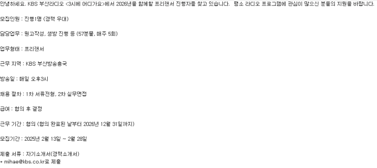 KBS 부산라디오<3시에 어디가요> 프리랜서 진행자 모집(~2/28)