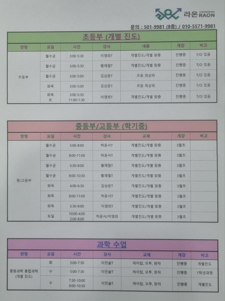 라온학원 3월 시간표 안내