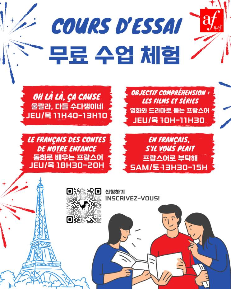 Cours d’essai | 무료 수업 체험 안내 프랑스어 수업을 무료로 체험할 수 있는 오픈데이를 진행합니다! 프랑스어가 궁금하셨던 분들, 새로운 방식의 수업을 경험해보고 싶은 분들 모두 환영합니다 프로그램 안내 Oh là là, ça cause jeudi B1 울랄라, 다들 수다쟁이네 목요일 (JEU) ⏰ 11:40 – 13:10 프랑스어로 편하게 이야기하며 말하기를 연습하는 수업 Objectif compréhension : Les films et séries B1/B2 영화와 드라마로 듣는 프랑스어 목요일 (JEU) ⏰ 10:00 – 11:30 자막에만 의존하지 않고 드라마나 영화를 더 잘 이해하기 위한 수업 Le français des contes de notre enfance jeu....... <img src="https://blogthumb.pstatic.net/MjAyNjAzMDVfNjkg/MDAxNzcyNjkzNzg3NDQ0._YVnq_fK9HOshXfMcOMbhZIIX1A5hBjVq2rcY77c5XEg.MmZghAr-02ZRufsMhAqPoo1ZfMWiPHYvlvTJ8IW5Xscg.PNG/Cours_d%27essai.png?type=s3" />