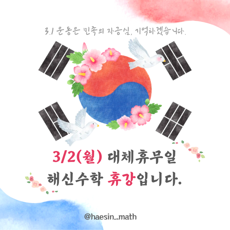 [동래수학학원-해신수학학원] 삼일절 대체휴무 휴강 공지