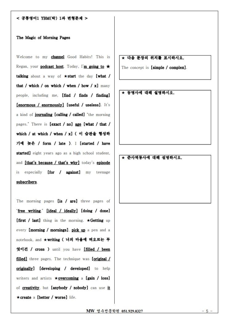 부산 동래구 명륜동 영어 엠더블유MW영수전문학원입니다. 2026년 부산 용인고 1학년 학생들을 위한 2022년 개정 고등 공통영어1 YBM(박) 1과 본문변형 내신대비자료입니다. 작년부터 고등학교 1학년 학생들의 교과서는 2022년 개정 교과서로 바뀌었고, 용인고는 공통영어1 YBM(박)교과서를 채택했습니다. 작년보다는 자료가 많아지고 있지만, 각 학교에 맞는 최적의 내신대비를 위해서 본원에서는 100% 자체제작교재를 이용하고 있습니다. 1과의 중요문법은 가주어, 진주어 구문과 동명사 입니다. 서답형도 빠짐없이 준비하였으며, 작년과 같이 학생들과 최선을 다할 예정입니다. MW 051 929 0327 영어 010 2068 0373 수학 010 4726 2678 *강의 중....... <img src="https://blogthumb.pstatic.net/MjAyNjAyMjdfMzMg/MDAxNzcyMTM4NDMzNTQ5.NJ9oAHSYHPb8lN7ZpGmmHkFu_1lkYSo4kEqHevPnlzQg.yuPo-s962iGtOAnB7yIbmMOLC6DtvKsR6pXcN8YIDKcg.JPEG/%B0%F8%C5%EB%BF%B5%BE%EE1_YBM%28%B9%DA%29_1%B0%FA_%BA%BB%B9%AE%BA%AF%C7%FC%B9%AE%C1%A6_5.jpg?type=s3" />
