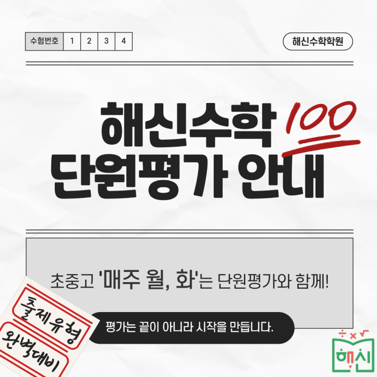 안녕하세요. "시작을 더 쉽게" 해신수학학원입니다. 해신수학 아이들은 매주 월, 화 단원평가를 치고 있습니다. 매주 25분밖에 안되는 단원평가가 어떤 차이점을 만들까요? 초등부는 학교 현행에 맞춰 20문항씩 25분간 시험을 칩니다. 중, 고등부 아이들은 내신대비를 위해 시험범위에 맞춰 중등 16문항, 고등 12문항 25분 동안 단원 평가를 시행하고 있습니다. 지속적인 단원평가를 통해 아이들은 '세 가지 기대효과'를 얻고 확실한 격차를 만들어 냅니다. 누수 차단 학습 수학은 누적된 개념이 가장 중요합니다. 배운 내용의 빠진 부분 혹은 부족한 부분을 선생님과 함께 즉시 보완합니다. 강심장 훈련 연습 때....... <img src="https://blogthumb.pstatic.net/MjAyNjAzMTlfMjM5/MDAxNzczOTAxMzU1NDcy.5J6C0o8ZaJznloSYFeKabNhSNoiEuFGdzC9N2kL5n3gg.ita0mfxjpooCT3SGNPWpPhFFlLZbARjmRMbcE4-Dy8gg.PNG/10.png?type=s3" />