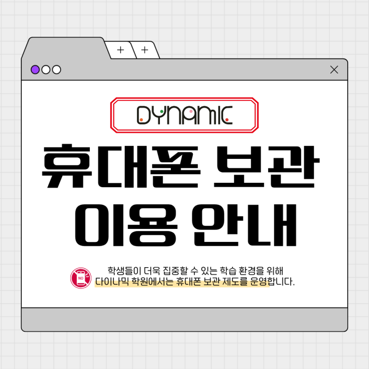 안녕하세요 다이나믹학원입니다 학생들이 보다 집중력 있는 환경에서 학습할 수 있도록 휴대폰 보관 제도를 운영하고 있습니다. 잠시 휴대폰과 떨어져 있는 시간은 아이들의 몰입도와 학습 효과를 높이는 소중한 시간이 됩니다. 아래 운영 내용을 꼭 확인해주세요. 문의 : 다이나믹 교육센터 051) 647.3235 <img src="https://blogthumb.pstatic.net/MjAyNjAyMjZfNCAg/MDAxNzcyMDgyNzU5OTkz.jZ8ByeoqgIyWBvl-_dRdvgE5me2QBPGgIs949NQQXCwg.BdMcqc75qByjQ0dQxXFlCcpfdsYR8ucFPEj0nr5ESX0g.PNG/1.png?type=s3" />