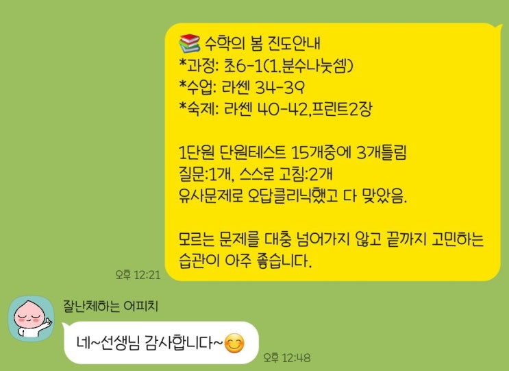 매번 신규상담을 할 때마다 학부모님께서는 내 아이의 진도가 어디쯤인지 내 아이가 어느 정도로 학습하고 있는지 잘 모르는 경우가 많습니다. 우리 학원에서는 초/중등 학생에 한해서 매달 또는 매 분기마다의 상담 전화가 아닌 매 수업마다 학습 안내문을 카톡으로 발송해 드리고 있습니다. TEST 여부나 학습진도량 또는 숙제량 그리고 숙제를 했는지 하지 않았는지에 대한 내용을 안내드립니다. 학원을 믿고 보내주시는 만큼 학부모님께서도 알고 계셔야 하는 부분은 공유하고 있으며 항상 만족해해 주셔서 매 수업마다 안내드리고 있습니다. 아이의 학습 시간이 헛되지 않도록 늘 신경 쓰도록 하겠습니다. 수학의 봄 학원에서 수학등급에 봄....... <img src="https://blogthumb.pstatic.net/MjAyNjAzMTdfMTUz/MDAxNzczNzQwOTQ4NzYy.-eWxfKjq7qGDlsfzhiLzqcGfMa8bQuX1EVGBTazD_uEg.NHrLnpHDkC4HSI5609qnAqoaS6pQg5iHh-6D9lXjwUEg.JPEG/KakaoTalk_20260317_161935776_02.jpg?type=s3" />