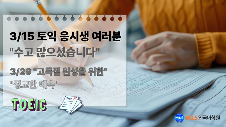 "Good morning" 안녕하세요! 부산 남구 대연동 MLS 외국어학원입니다. 어제 일요일, 차가운 아침 공기를 뚫고 고사장으로 향했던 수험생 여러분, 정말 고생 많으셨습니다. 그동안 흘린 땀방울이 헛되지 않도록 진심 어린 박수를 보냅니다. 비록 어제의 시험이 누군가에게는 만족을, 누군가에게는 아쉬움을 남겼겠지만, 그 모든 과정은 반드시 여러분의 실력으로 치환될 것입니다. "지속적인 노력은 지능이나 힘이 아니라, 잠재력을 깨우는 열쇠입니다." 어제의 경험을 발판 삼아, 2주 뒤인 3월 29일 시험에서 마침표를 찍을 수 있도록 MLS가 함께하겠습니다. 토익 응시생 여러분 수고 많으셨습니다! "3월 29일 고....... <img src="https://blogthumb.pstatic.net/MjAyNjAzMTVfNTMg/MDAxNzczNTcxMjY0MTEw.bOJEx5xMBW4G-JLj8pQ8sQv7rF3dq7lx4fYjdb90Nl4g.wPblhw-GZTs-Ldn3Z9J4HA0t9EQTmMZDiSH_StW4UZsg.JPEG/4-%C5%E4%C0%CD_%BD%E6%B3%D7%C0%CF1.jpg?type=s3" />