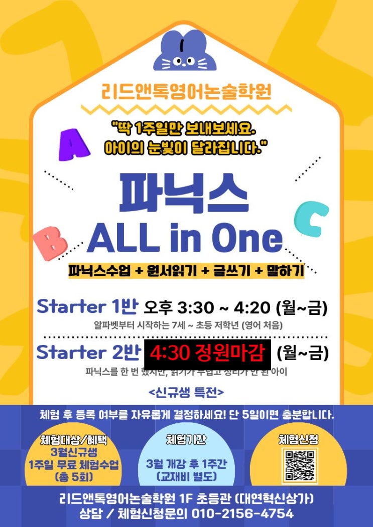 * 4:30 수업 정원 마감 안내* 학부모님들의 많은 관심으로 Starter 2 (오후 4:30 수업)은 현재 정원 마감되었습니다. 예상보다 빠른 문의와 등록으로 현재는 대기 등록만 가능한 상태입니다. 대기등록을 희망하시는 학부모님께서는 미리 문의 부탁드립니다. 파닉스는 배웠는데, 왜 영어책은 못 읽을까? 많은 학부모님들이 하시는 질문입니다. 알파벳과 파닉스를 배웠는데도 아이가 영어책을 읽지 못하는 이유는 무엇일까요? 대부분의 경우 ✔ 소리만 배우고 ✔ 실제 읽기 훈련이 부족한 ‘반쪽짜리 파닉스 학습’ 때문입니다. 리드앤톡영어논술학원의 파닉스 All in One 프로그램은 단순히 파닉스 규칙을 외우는 수업이 아닙니다. ✔ 파닉스 원리....... <img src="https://blogthumb.pstatic.net/MjAyNjAzMDVfMTY0/MDAxNzcyNjk0NjM0OTU5.eg4FfsmAWTjFb1z4Nb0uDh9O8vMMyEVuSHUGF7KP2wUg.CwkCoOUZIKWPq9wwbpCwb8CSF66B4izE7uTKG07MatYg.JPEG/%C6%C4%B4%D0%BD%BA_%BF%F8%BE%EE%B9%CE_%B4%D9%B5%B6.jpg?type=s3" />