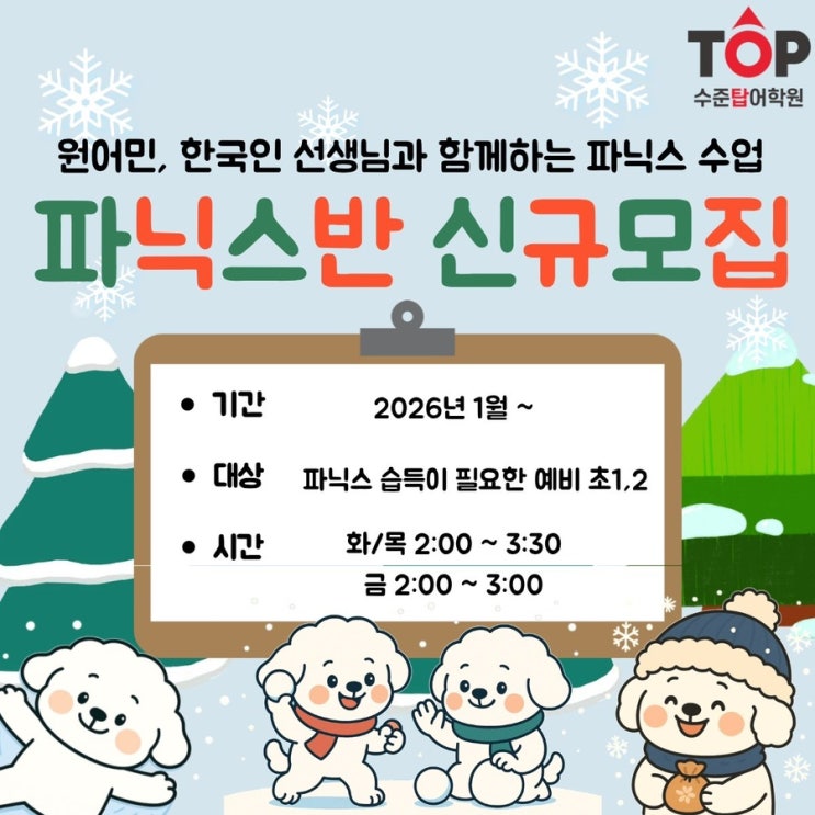 파닉스반 신입생 모집입니다. 파닉스만 했을 뿐인데 8개월 만에 스피킹 대회 '은상·동상' 석권? (예비초 1,2학년 집중모집) 안녕하세요, 수준탑어학원 원장입니다. 영어를 처음 시작하는 우리 아이, 단순히 글자만 읽는 법을 배우고 있나요? 파닉스는 단순히 '읽기'가 아니라 '말하기의 기초'여야 합니다. 저희 학원에서 파닉스로 시작한 지 단 8개월 만에, 아이들이 자신 있게 무대 위에서 영어로 말하며 전국 규모 스피킹 컨테스트 은상과 동상을 수상하는 쾌거를 이루었습니다! 이 놀라운 결과가 가능했던 이유, 바로 수준탑어학원 만의 특별한 '원어민+한국인 더블 티칭' 시스템 덕분입니다. 왜 수....... <img src="https://blogthumb.pstatic.net/MjAyNTEyMThfMTQy/MDAxNzY2MDUxODMzOTE0.nOBvDyCk-VkfK6jMmvH98Twzae5KyPAkjqwnN7mLqM0g._gWk9ZFNWRpdEZXdAK7ykz3N1XkDb5XiTKZfhpYTH3Mg.JPEG/IMG%A3%DF7364.JPG?type=s3" />