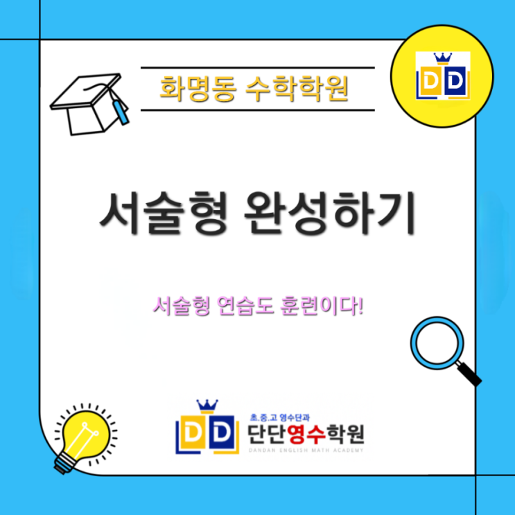 1일 무료수강체험 및 학원 첫달수강료 50%할인 이벤트 진행중입니다. 위 링크로 클릭후 쿠폰다운로드 하세요. 또는 학원방문시 50% 할인혜택 드립니다. 화명동 수학학원 3월, 서술형 연습도 훈련이다!! 3월, 서술형 연습도 훈련이다! 3월은 새 학기가 시작되는 중요한 시기입니다. 서술형 문제는 단순히 정답만 맞추는 것이 아니라 풀이 과정과 논리를 정확하게 표현하는 능력이 중요합니다. 따라서 다음과 같은 방식으로 훈련을 진행합니다. 1.예제를 먼저 따라 풀어보기 교재에 있는 예제 문제를 먼저 풀어보며 문제의 흐름과 풀이 방법을 이해합니다. 2.조건을 단계별로 세우기 문제에서 주어진 조건을 하나씩 정리하고 어떤 순서로 해결....... <img src="https://blogthumb.pstatic.net/MjAyNjAzMTBfNjQg/MDAxNzczMTQ3NDY5NDc5.Dkabcx3wf6lecZik781BvAFVlefD34t8prDq55A_UuQg.sANk49tfmdzczIkdO8MK-_LNUWT2TiYPWnNnpDkKeXwg.PNG/900%A3%DF001%A3%DF20260310%A3%DF214658.png?type=s3" />