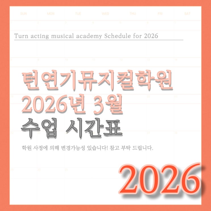 안녕하세요! 꿈을 향한 가장 힘찬 회전, 턴(TURN)연기뮤지컬학원입니다. 입시의 본격적인 시작을 알리는 3월이 다가왔습니다. 누구보다 빠르게, 하지만 누구보다 탄탄하게 기초를 다지고 싶은 수험생 여러분!! 3월 시간표을 공개합니다! 왜 '턴(TURN)'인가? 우리 학원만의 특징 1:1 맞춤형 밀착 관리: 대형 학원의 시스템과는 차별화된 소수 정예 수업으로, 학생 한 명 한 명의 장점을 극대화합니다. 현장 중심 교수진: 현역 배우 및 입시 베테랑 강사진이 '지금 바로 통하는' 실전 감각을 전수합니다. 올인원 커리큘럼: 연기, 보컬, 무용까지! 입시에 필요한 모든 요소를 한곳에서 완벽하게 해결합니다. 무한 연....... <img src="https://blogthumb.pstatic.net/MjAyNjAyMjdfMjI0/MDAxNzcyMTkwNTIwMDgy.eRXMK0eZ3Ho9W2uHt_s8En3Js7Jz6Q8KwgzTnJMxPaog.HtUs6LVX5TSXXGuZCwLY_b2jV5U_OdfezR1v5b1uxPEg.JPEG/%BD%C3%B0%A3%C7%A5%C7%A5%C1%F6_-001_%285%29.jpg?type=s3" />