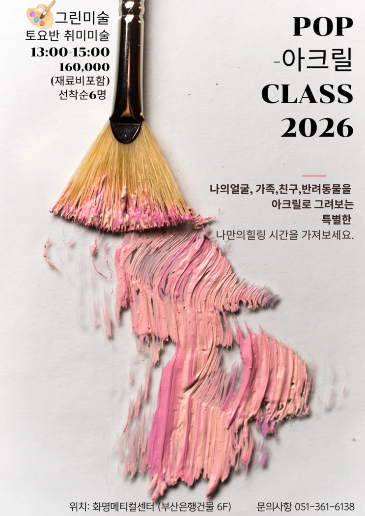 2026. 토요일 13:00-15:00까지 아크릴 취미미술반이 개설되엇답니다! “색으로 만나는 나의 시간” 아크릴 취미 미술반 모집 안내 색으로 쉬어가는 시간, 아크릴 취미 미술 바쁜 일상 속에서 오롯이 나에게 집중하는 시간, 가져본 적 있으신가요? 아크릴 물감은 색이 선명하고 마르기 쉬워 처음인 분들도 완성의 즐거움을 느끼기 좋은 재료입니다. 그림을 잘 그리지 않아도 괜찮아요. 차근차근 따라오다 보면 어느새 집에 걸고 싶은 나만의 작품이 완성됩니다. 초보자 환영 기초부터 단계별 지도 소수정원 · 힐링 수업 지금, 그림으로 나를 쉬게 해주세요. - 아크릴 취미 미술반 · 초보자 환영 문의: 그린....... <img src="https://blogthumb.pstatic.net/MjAyNjAxMDVfMTU3/MDAxNzY3NjA4ODA2Mzcx.MkNGEMeCqC77hYfEcrKQ_CGWzLvKVlibLYNVubLvgH0g.2av-MstGYvEFoBZsbyoFrXp6Akf35l1pXlWzf91BpLog.PNG/WELCOME_SUMMER_%A3%A8Poster%A3%A9_%A3%AD_5.png?type=s3" />