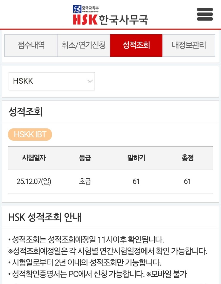2025년 12월7일 HSKK 시험(초급) 성적표