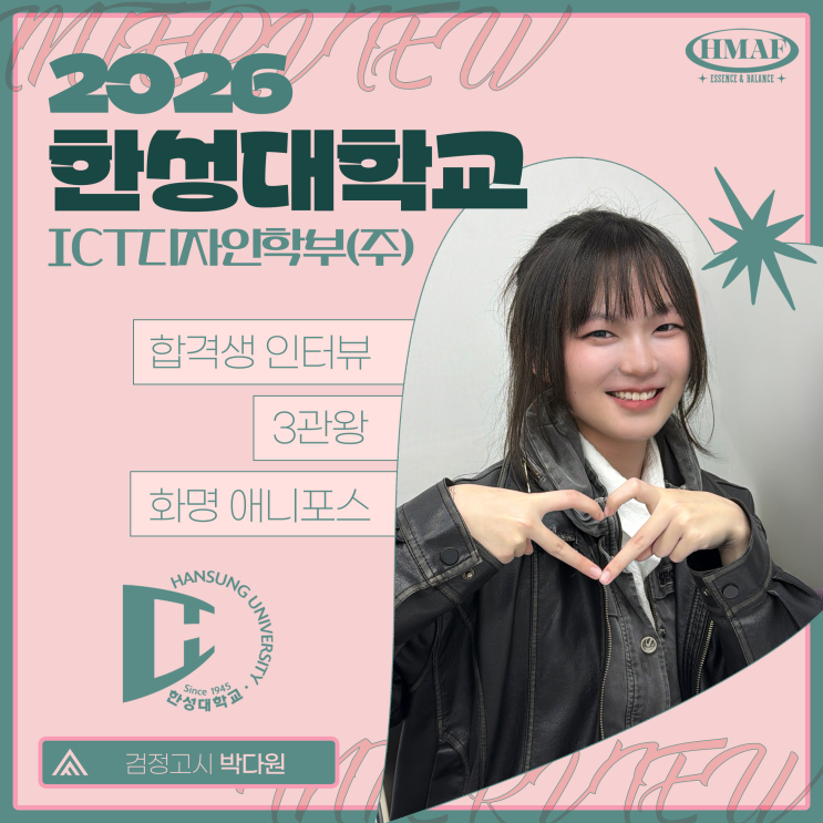 2026 한성대 ICT디자인학부(주) 수시 합격생 인터뷰입니다. 인터뷰는 부산 화명 애니포스 만화학원의 민제우 원장님이 직접 진행합니다. 촬영 - 선우T 2026 화명애니포스 4기 중앙대, 경기대, 홍익대, 청강대, 상명대, 한성대, 건국대, 공주대, 부산대, 동아대, 경성대, 계명대, 동서대 이 외 다수 대학 합격을 축하합니다! 위 결과는 화명애니포스 수시반 단 27명만의 결과입니다. 이 학생은 화명애니포스 중복합격자로, 본 게시글은 한성대학교 위주의 인터뷰 내용이 담겨있습니다. 제우T > 한성대학교에 지원한 동기가 있나요? 다원 > 애니메이션만 배우기보다는 영상 촬영과 편집, 3D와 만화 등 다양한 분야를 배워보고 싶어서....... <img src="https://blogthumb.pstatic.net/MjAyNjAxMjhfMjcw/MDAxNzY5NjA2ODQ0NTMy.gOTd8EYK72F1idcWMP9jPMAyIZrWPITeOa3hFXH8DMYg.CYdmVxJf2QT9QrmeEcgDzv_4cdjgqto0Wa8Dv1VLRZ0g.PNG/image.png?type=s3" />