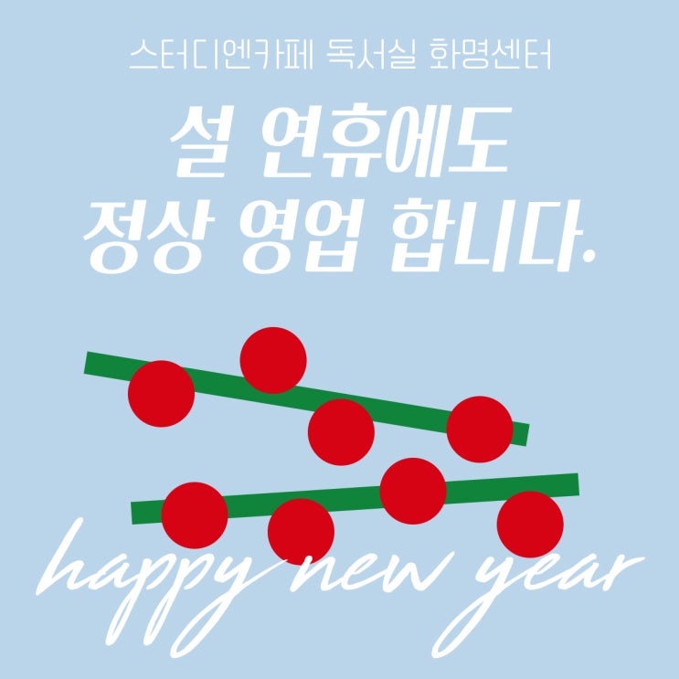 안녕하세요 ! 스터디엔카페 독서실 화명센터 김실장입니다. 2026 다가오는 설 연휴에도 회원님들의 학습을 응원하기 위해 정상 영업을 진행합니다! ✔ 영업시간 : 오전9시 - 새벽1시 ✔ 열람실 변경 및 장기 결제는 설 연휴 전에 미리 연락주시면 감사하겠습니다 :-) 멀리 타지에서 오신 분들을 위해, 1인실 열람실 1일권 금액 할인 이벤트도 진행될 예정입니다 :) ☑ 몰입형 열람실 / 1일권 : 11,000원 ☑ 독립형 열람실 / 1일권 : 10,000원 문의사항은 블로그 댓글 혹은 010-6647-8509로 전화/문자 남겨놔주세요! 편안하고 조용한 학습 공간에서 새해 목표를 차근차근 준비해보세요! 따뜻한 공간에서 여러분의 열정을 응원하겠습....... <img src="https://blogthumb.pstatic.net/MjAyNjAyMDJfMTEz/MDAxNzcwMDM4NjI1NDg4.ui-N98ML0A1KGjogQdbUAE8kR4OelRjImf5ucuI6lRQg.1VA5KdVJQx9FvTEi0Zd-sWUpEAJMb2OyZKX1nwwNkjwg.JPEG/2026%BC%B3%B3%AF%C1%A4%BB%F3%BF%B5%BE%F7_2.jpg?type=s3" />