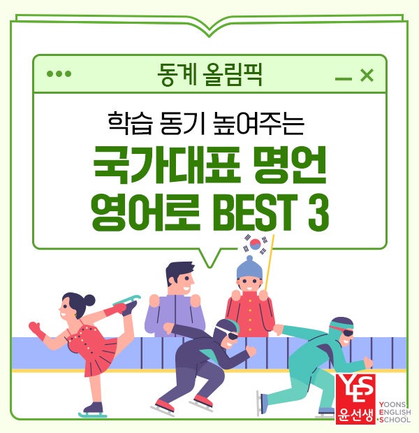 2026 동계올림픽 일정은 2026년 2월 7일부터 2월 23일까지 입니다. TV 앞에서 우리 선수들을 응원하는 아이들의 눈도 그 어느 때보다 반짝일 예정인데요. 아이들의 눈이 반짝이는 이 순간, 올림픽을 단순히 보는 즐거움으로만 끝내기 보다는 아이 영어 학습의 의지를 끌어올릴 수 있도록 동기 부여의 시간으로 만들어보면 어떨까요? 오늘은 대한민국을 빛낸 겨울 스포츠 스타들의 명언을 영어로 배워보고, 그 속에 담긴 마음가짐까지 온전히 느낄 수 있도록 해보아요! 국가대표 선수 3인의 동기부여 명언 영어로 어떻게 말할까? 1. 피겨 여왕 ‘김연아’ “99도까지 열심히 올려도 마지막 1도를 넘기지 못하면 물은 끓지 않아요 물을 끓이는 건 마....... <img src="https://blogthumb.pstatic.net/MjAyNjAyMDVfMTgz/MDAxNzcwMjU0NjIyMjI1.qvcd9ml-toz3N6JUpxHdJ5WT3_0J9RqzCxOOud-fNpwg.QZTadxuHaESlrBukHxhFDdJKObET_tlLoNKONWRl4Hog.JPEG/%BA%ED%B7%CE%B1%D7%BD%E6%B3%D7%C0%CF.jpg?type=s3" />