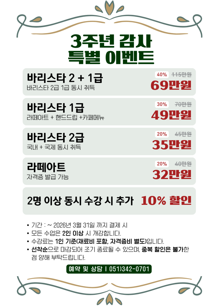 그동안 보내주신 성원에 감사드리며 3주년을 맞아 특별 수강료 할인 혜택을 제공합니다. 바리스타 2+1급 115만원 → 69만원 바리스타 1급 70만원 → 49만원 바리스타 2급 45만원 → 35만원 라떼아트 40만원 → 32만원 2인 이상 동시 수강 결제 시 추가 10% 할인 ▸ 할인기간 : ~ 2026년 3월 31일 까지 결제 시 적용 • 모든 수업은 2인 이상 시 개강합니다. • 수강료는 1인 기준(재료비 포함, 자격증비 별도)입니다. • 선착순으로 마감되어 조기 종료될 수 있습니다. • 중복 할인은 불가한 점 양해 부탁드립니다. ✔️국내 바리스타 자격증 필기시험 면제 ✔️라떼아트 과정 수강 시 자격증 발급 가능 ✔️자격증 심사위원 직강 수업 2인....... <img src="https://blogthumb.pstatic.net/MjAyNjAxMjZfNTIg/MDAxNzY5NDA1MTc1Nzky.aivebzKRuUsdq3_G_Mynq1TIU6FxU44BtKWELw--v9Ig.o6IbxXJmURke1Qa6lxV1CzTB3DaMT1Od52SXiLlThx4g.PNG/3%C1%D6%B3%E2_1.png?type=s3" />