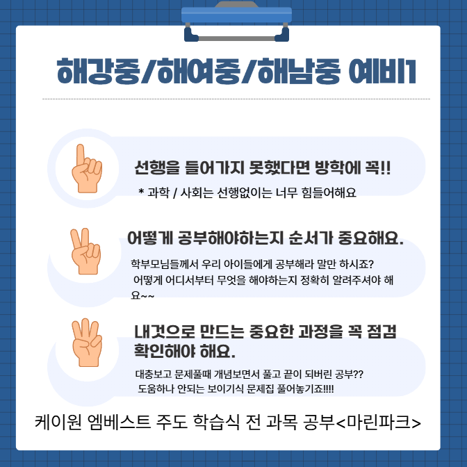 예비중1 학부모님 꼭 준비하셔야 하세요!! 준비를 잘하고 있는 친구들도 있겠지만 학교들어가면 그때 계획세워서 해야지 하는 친구들 절대 아니되어요!!!!!!!힘들어요~~ 학교들가가면 바로 수업이 들어가고 배우지 못한 우리친구들은 선생님의 설명을 이해했을까요? 그때 학원을 다니면 진도빼기 바쁘고 한과목도 아니고 너무 힘들지 않을까요? 점수 결과 잘나올까요? 수학만큼이나 어려운 과학 선행없이는 정말 힘들어요~ 고학년을 둔 학부모님들은 아마 다 아실거예요~ 개학 들어가서는 다지기예요 ^^ 방학에는 노는 시간이 아니라 앞으로의 다음 학기 준비해야하는 중요한 시기예요~~ 방학에 앞선 공부를 하고나면 수업시간 집중도도 많이 달....... <img src="https://blogthumb.pstatic.net/MjAyNTEyMjRfMjg2/MDAxNzY2NTU2NTg5NDEy.6Jtqs2E0tQW7tWn0Dpy2T1q6Es0WgawXLtERD7zlDBog.r0-KfNK3jo7Xhx30XJgi-jXKSUMtOre4biyoQBpCXRAg.PNG/%C8%AD%B8%E9_%C4%B8%C3%B3_2025-12-24_150910.png?type=s3" />