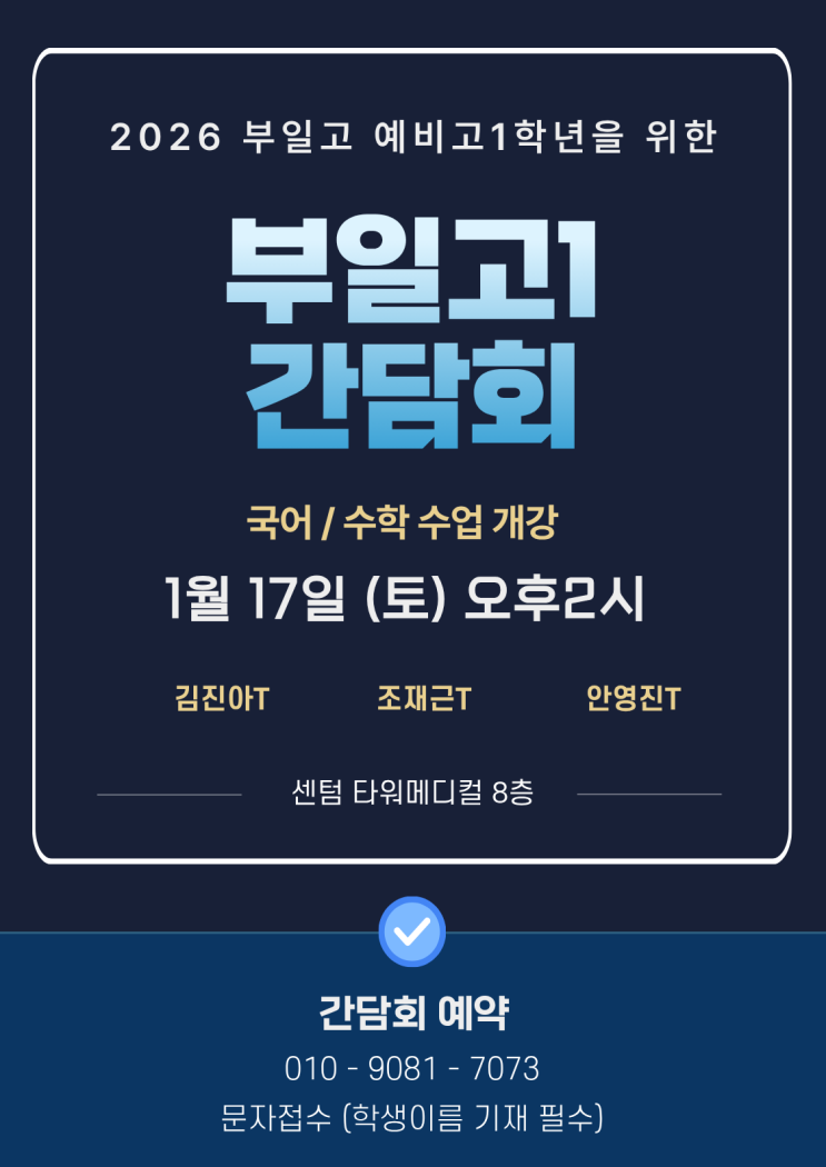 부일고 입학을 축하드립니다!! 부일고 내신반 개강 안내드립니다. 매년 자사고 전교 1등과 1등급을 최다 배출한 거탑입니다. 이번 간담회에서 부일고 내신 대비 학습 전략을 알려드리겠습니다. ✔️김진아T -고려대학교 국어국문학과 -연세대학교 국어교육학 석사 -국어 1급 정교사 자격증 소지 -전) 해운대고 교사 -전) 대성학원 재수종합반(최우수 강사상 수상) -전) 대치명인학원 -전) 포엠학원 -전) 하얀거탑 국어학원 원장 -현) 거탑국어 원장 ✔️조재근T -한국과학영재고 조기졸업 -KAIST 기계공학부 -현) 거탑학원 원장 -전) 대치시대인재학원 -전) 대성학원 재수종합반 -전) 대치명인학원 ✔️안영진T - 부산대 수학교육과 - 현) 거탑학....... <img src="https://blogthumb.pstatic.net/MjAyNjAxMTBfMTYz/MDAxNzY4MDM2MDI3MDY0.TzOlPVBOfC1t4HJZz93FYJB4i3eDziiS0qun3X5OTdYg.1z28Lc_oy93jGV7IvrBR8aMGdPEAzoiMwRtDhW9RmGMg.PNG/%C1%A6%B8%F1%C0%BB_%C0%D4%B7%C2%C7%D8%C1%D6%BC%BC%BF%E4_%281%29.png?type=s3" />