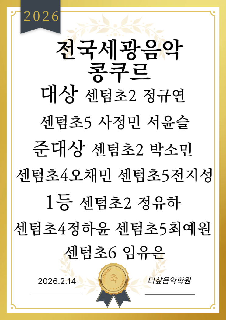 우리 더샾친구들 콩쿨 전원입상을 축하합니다 그동안 선생님들 잘따라와줘서 고마워. 과정도 결과도 너무 좋은 더샾 원장선생님. 강사선생님들 수고 않으셨고 감사합니다. #피아노 #초등방과후 #센텀음악학원 #센텀 #해운대 #센텀피아노 #부산음악학원 #콩쿨 #부산 <img src="https://blogthumb.pstatic.net/MjAyNjAyMTdfMjAy/MDAxNzcxMzM0MTc4NTQ5.YBJi1LR-vsUQiG8x8JmLQRIciYGVrnoGHyf00XwBq4Ug.ESLWflTbzZAhrzlsTuyWDZJ0umZOsxswu8FC1zBpjJgg.PNG/1771334166680.png?type=s3" />