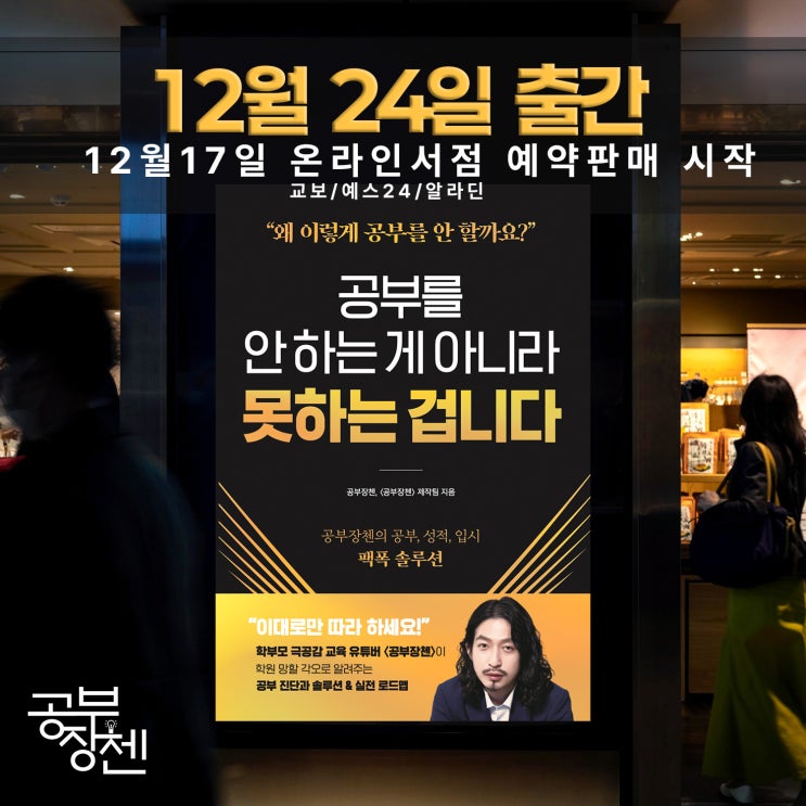 드디어, 우리 멋진 원장님, 여러분의 공부고민해결사 [해운대 공부장첸]이 첫 번째 책을 출간합니다! 제목은 「공부를 안 하는 게 아니라 못하는 겁니다」 줄여서 [공.안.못]이라 읽습니다. *12월 17일부터 교보문고 · YES24 · 알라딘에서 예약판매를 시작합니다. 오랫동안 현장에서 학생들, 학부모님들을 만나면서 많은 가르침을 얻었습니다. 그 가르침을 통해 저희도 조금씩 성장하고 있습니다. 이 자리를 빌어, 저희를 거쳐간 많은 학생들, 학부모님들께 그리고 유튜브 구독자분들, 인스타 팔로워분들께 감사인사 드립니다. 공부 때문에 매일 아이와 전쟁 중인 학부모님들을 위해, 이 전쟁을 끝내러 왔습니다. 상위권 중심으로 짜인 기존 교육....... <img src="https://blogthumb.pstatic.net/MjAyNTEyMTJfMzQg/MDAxNzY1NTQ3NjI1Njgy.4EWQtHZhP1QrS9Kk2xbzglaRQW1UBXbXV6QYyXCgfsEg.bb_6t0Y5BVg_a2avQtYy1T9ha3jD7bCWhdYKg2MXo3gg.JPEG/%C3%E2%B0%A3%C0%CC%B9%CC%C1%F61_%282%29.jpg?type=s3" />