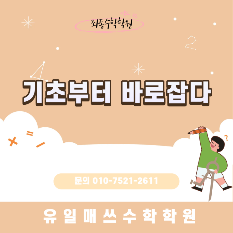 초등학교 때까지는 곧잘 따라가던 아이들도 중등 과정의 복잡한 식과 낯선 기호들을 마주하면 겁부터 먹기 마련입니다. 특히 한 번 진도를 놓치면 다음 단계로 넘어갈 수 없는 수학의 연계성 때문에 기초가 부족한 학생들은 학교 수업 시간 내내 무기력함을 느끼곤 합니다. 하지만 지금 당장의 성적이 낮거나 수학이 어렵게 느껴진다고 해서 좌절할 필요는 없습니다. 수학은 속도가 아니라 방향이며 학생의 현재 수준에 맞춰 빈 틈을 메워나간다면 언제든 다시 일어설 수 있는 과목이기 때문입니다. 학년이라는 틀에 갇혀 진도만 쫓아가는 학습 방식은 기초가 약한 학생들에게 밑 빠진 독에 물 붓기와 같습니다. 이러한 문제를 근본적으로 해결하....... <img src="https://blogthumb.pstatic.net/MjAyNTEyMThfODQg/MDAxNzY2MDIxODk2MjU5.gGZCj1DznduOElj0zkzutQREi4ewqMNCB7YebMjnThcg.b-PladHwipU_Wmj5k8savFZdEOqrVuQuY5bMOXyG8LEg.PNG/9-%C0%AF%C0%CF.png?type=s3" />