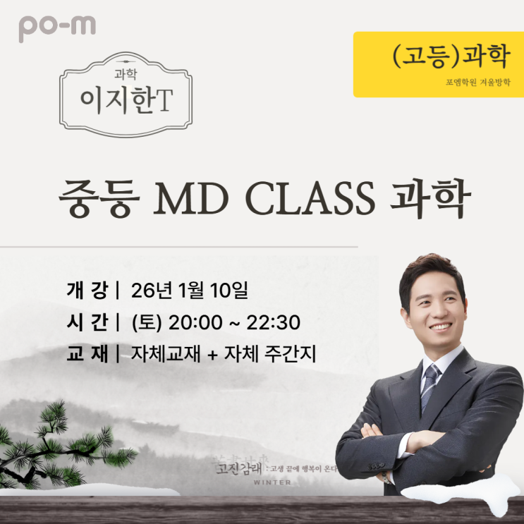 메디컬 과학 프로젝트 D-4 메디컬 과학의 절대강자 이지한T 직강! 중등 MD Class 과학 1월 10일 개강!! “과정을 쌓는 공부가, 결과를 만듭니다" 포엠과학 이지한 선생님만의 단독 커리큘럼, 중등 MD CLASS 과학 개강! 격차는 지금부터 벌어진다! 격차를 벌릴 수 있는 메디컬 핵심과목 통합과학 + 생명과학! 지금 시작하면 고등 내신과 수능에서 확실한 차이를 만듭니다. 중등 시기의 현명한 선택이 고등 실력을 만듭니다. 이지한 선생님의 MD Class 과학은 ‘EASY’한 명강의와 고퀄리티 교재로 단순한 예습이 아닌 수능까지 이어지는 심화 학습으로 고등과학의 틀을 완성합니다. 포엠에서 준비하면 결과가 다릅니다. 메디컬....... <img src="https://blogthumb.pstatic.net/MjAyNjAxMDZfMjg4/MDAxNzY3NjgzNTIzODU5.4xgmR3kxPAFQ_3P0pvjg4UsJIyGLh3Hx1Z9aQf6XYREg.7EztPY6xoUkGf5yJV89wjIQRPQmrYh0cJRTV8G86i_Eg.PNG/%BC%BE%C5%D2%C0%CC%C1%F6%C7%D1T%C1%DF%B5%EEMD-001.png?type=s3" />