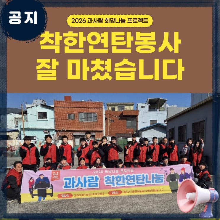 2월 21일 부산 연탄봉사활동 학생 30여 명과 선생님이 함께한 따뜻한 하루 2월 21일, 과사람 학생 30여 명과 선생님들이 함께 부산 연탄봉사활동에 참여했습니다. 입시와 학습으로 바쁜 일정 속에서도 아이들이 직접 몸으로 나눔을 경험하는 시간을 마련했습니다. 공부만 잘하는 학생이 아니라, 따뜻한 마음을 가진 학생으로 성장하길 바라는 마음이 담긴 활동이었습니다. 1. 연탄지게 체험 – 무게를 직접 느끼다 처음으로 연탄지게를 메어본 학생들. 연탄 한 장은 약 3.6kg, 몇 장만 쌓아도 결코 가볍지 않은 무게입니다. 아이들은 지게를 메고 “생각보다 훨씬 무겁다”는 말을 반복했습니다. 책에서 배우는 봉사와 몸으로 느끼는 봉사는 다릅....... <img src="https://blogthumb.pstatic.net/MjAyNjAyMjFfMTEz/MDAxNzcxNjU2Mjc5NTc2.STuqGVA4GADDjafl8_oLSIx8MUgbYC39vHTX9B_qxqYg.D18gnbe9as3gZ6NvTOpelCZZt8qNbomT06cYTJpQ1FYg.JPEG/%BF%AC%C5%BA%BA%C0%BB%E7_%BD%E6%B3%D7%C0%CF.jpg?type=s3" />