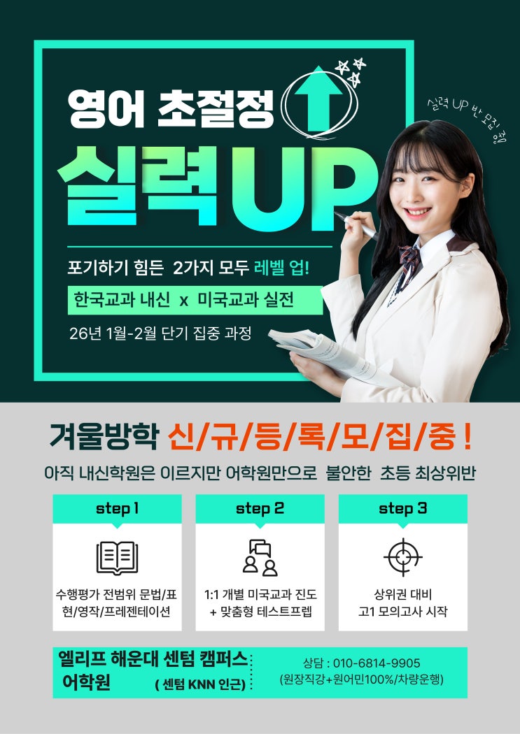 영어는 중학교때 기초부터 잘 다져서 수능 수준까지 끌어 올리면 고등학교 올라가서 훨씬 공부가 수월하며 다른 과목에 시간 투자를 더 할 수 있어서 대입 준비에 경쟁력을 갖출 수 있는 과목입니다. 입시준비 시작과 마무리는 웹스터 좌동 영어에서 ~!!! 예약 및 상담 ☎ 010-8159-4601 <img src="https://blogthumb.pstatic.net/MjAyNjAxMTJfNjkg/MDAxNzY4MTk1MzExOTA0.fkxGYsLJo54YshFcgAt8B-Q9yqwn4_ZkQrgSocYi-cAg.TkEO6Qa3XoEV0LQ9R6PihAMO5sUBV5j0XOzIGjAO1hsg.JPEG/%BF%B9%BA%F1%C1%DF1.jpg?type=s3" />