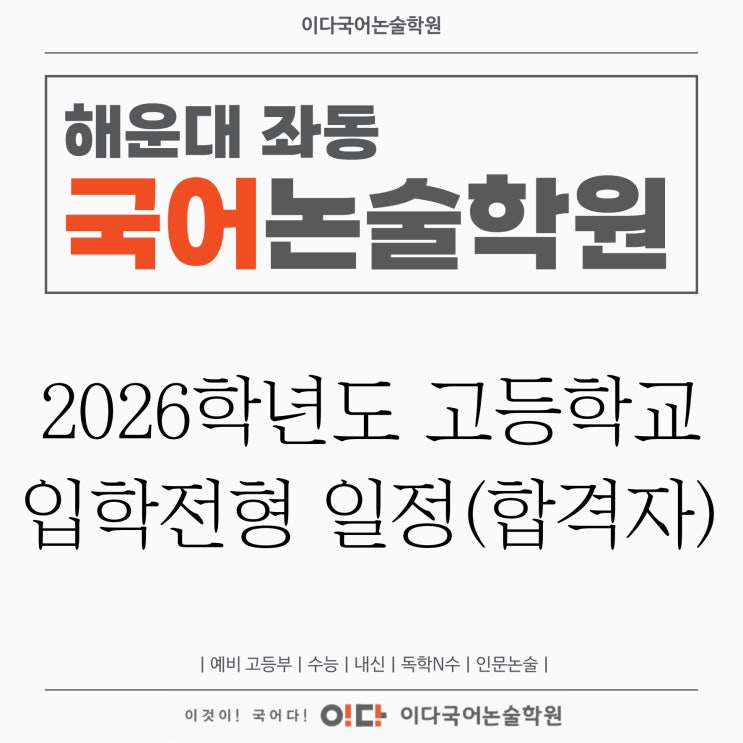 안녕하세요 해운대 중학생 국어학원 이다국어논술학원입니다 2026학년도 고등학교 입학전형은 2025년 8월 과학고 원서교부접수를 시작으로 2026년 1월 평준화적용 일반고 합격자 발표까지 순차적으로 진행되고 있어요 26년 1월 13일인 현재 전기학교로 분류되는 과학고, 예술고, 체육고, 마이스터고, 특성화고와 후기학교로 분류되는 외국어고, 국제고, 자사고, 일반고 등 대다수의 고등학교가 합격자 발표를 마친 상황이죠 전기학교의 경우 전년도 12월에 입학 등록까지 마친 상황이고, 후기학교도 평준화 일반고를 제외하고는 입학 등록을 마친 상황이에요 "아 그러면 이제 특목고나 자사고 등에 들어갈 수 있는 방법은 전혀 없는건가요?&....... <img src="https://blogthumb.pstatic.net/MjAyNjAxMTNfNjEg/MDAxNzY4MjkxNjI4OTUx.CWS4GvbmMqYfAupJsI4s0kKJJ8dtenWv09cucvpm3Uwg.d1amGF32cYTu4jgWbcgafiHh4uXUXZeDWDp2tLWz5eMg.JPEG/%C0%CC%B4%D9%B1%B9%BE%EE-%B3%D7%C0%CC%B9%F6-%BA%ED%B7%CE%B1%D7-%C1%A4%BB%E7%B0%A2%C7%FC-005_%282%29.jpg?type=s3" />